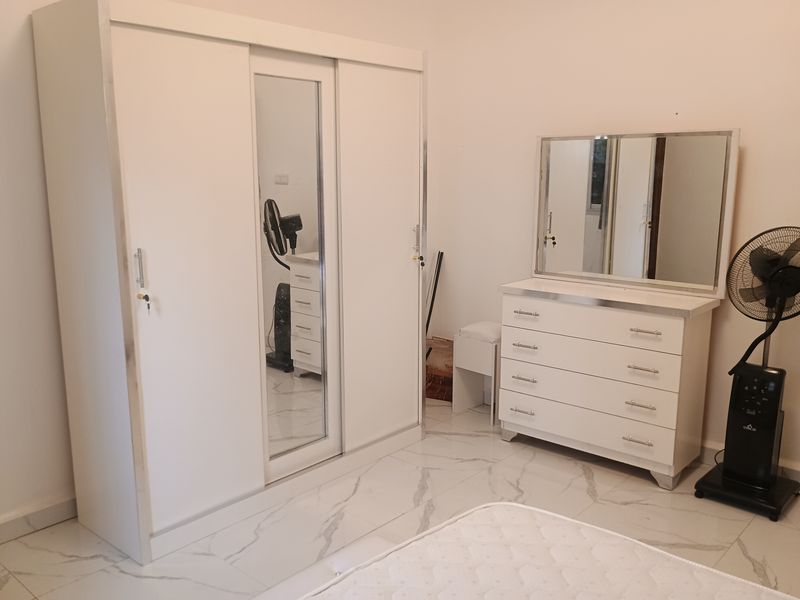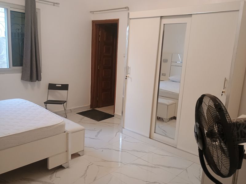 Cette chambre est équipée d'un lit 2 places avec 2 tables de chevets, d'une armoire 3 battants, d'une coiffeuse, d'une salle de bain privée, d'un ventilateur et d'un climatiseur.